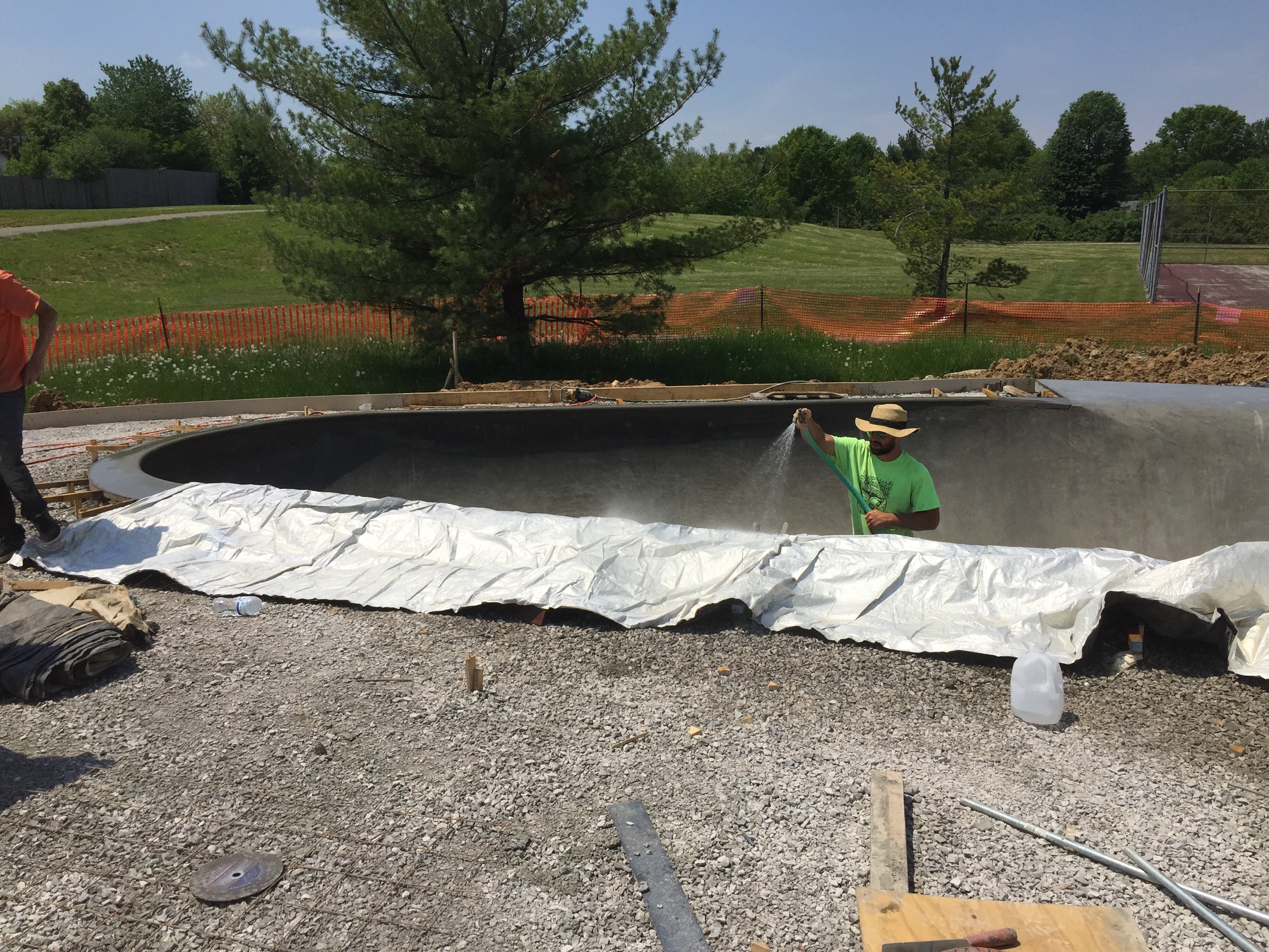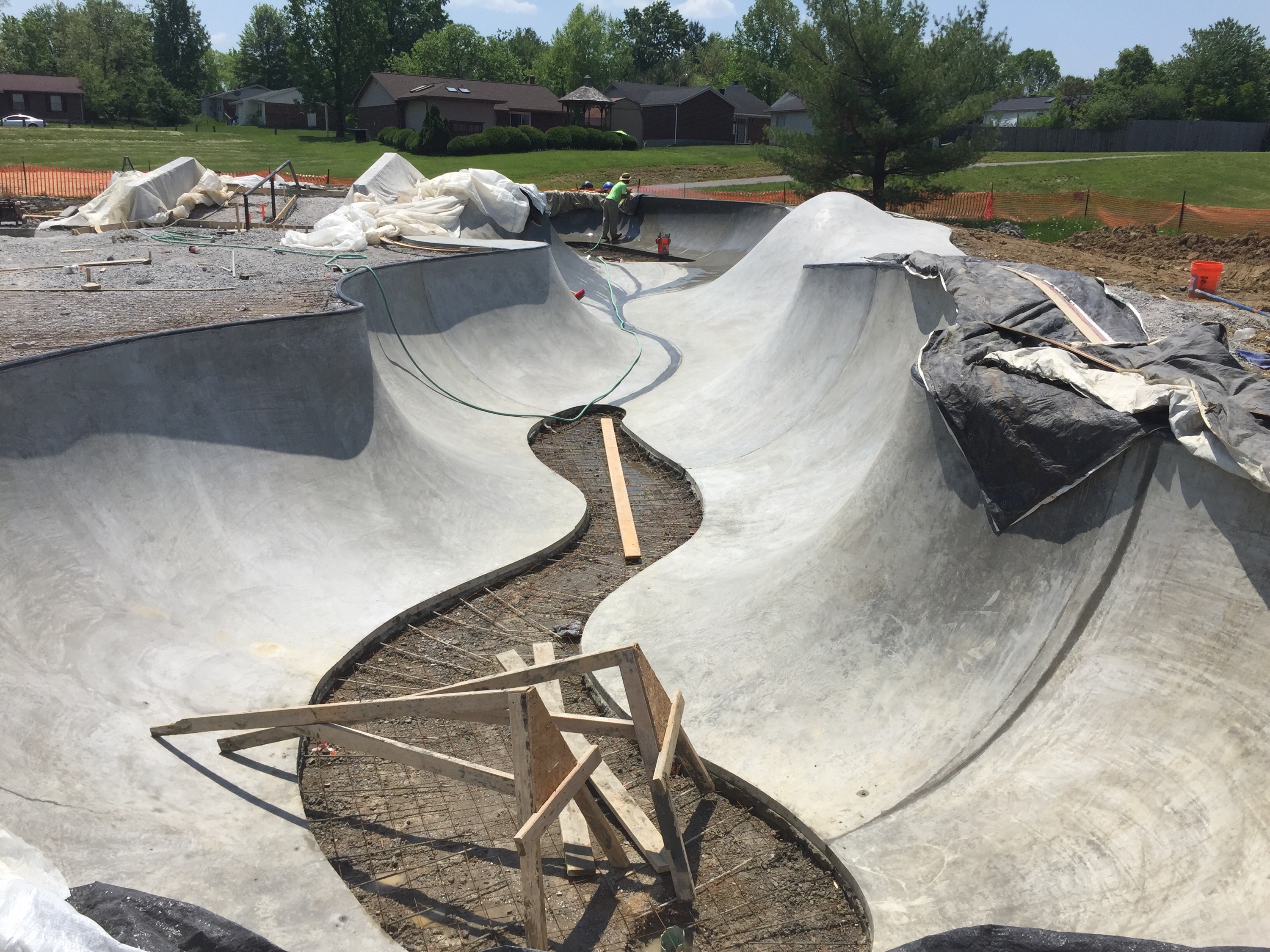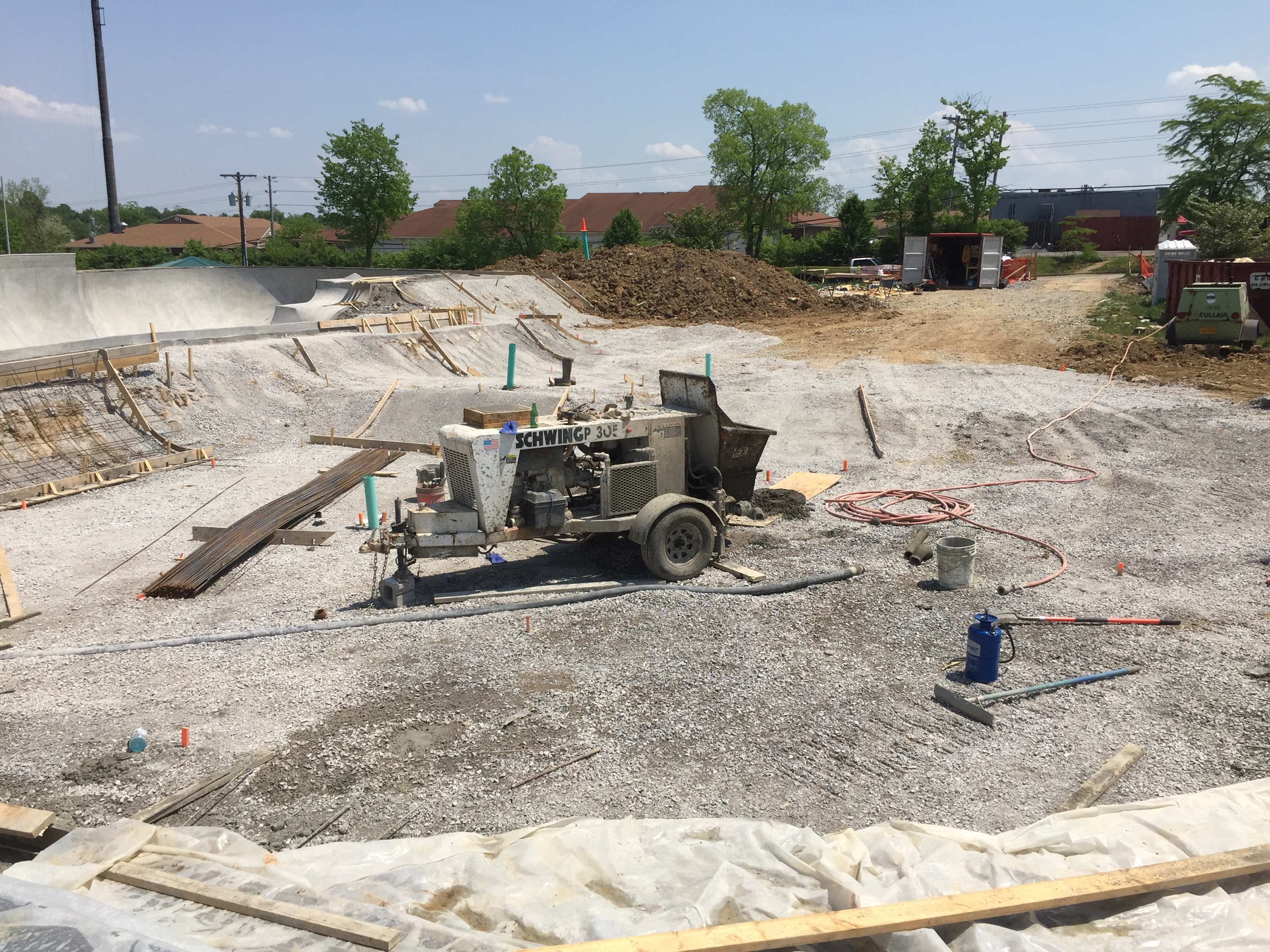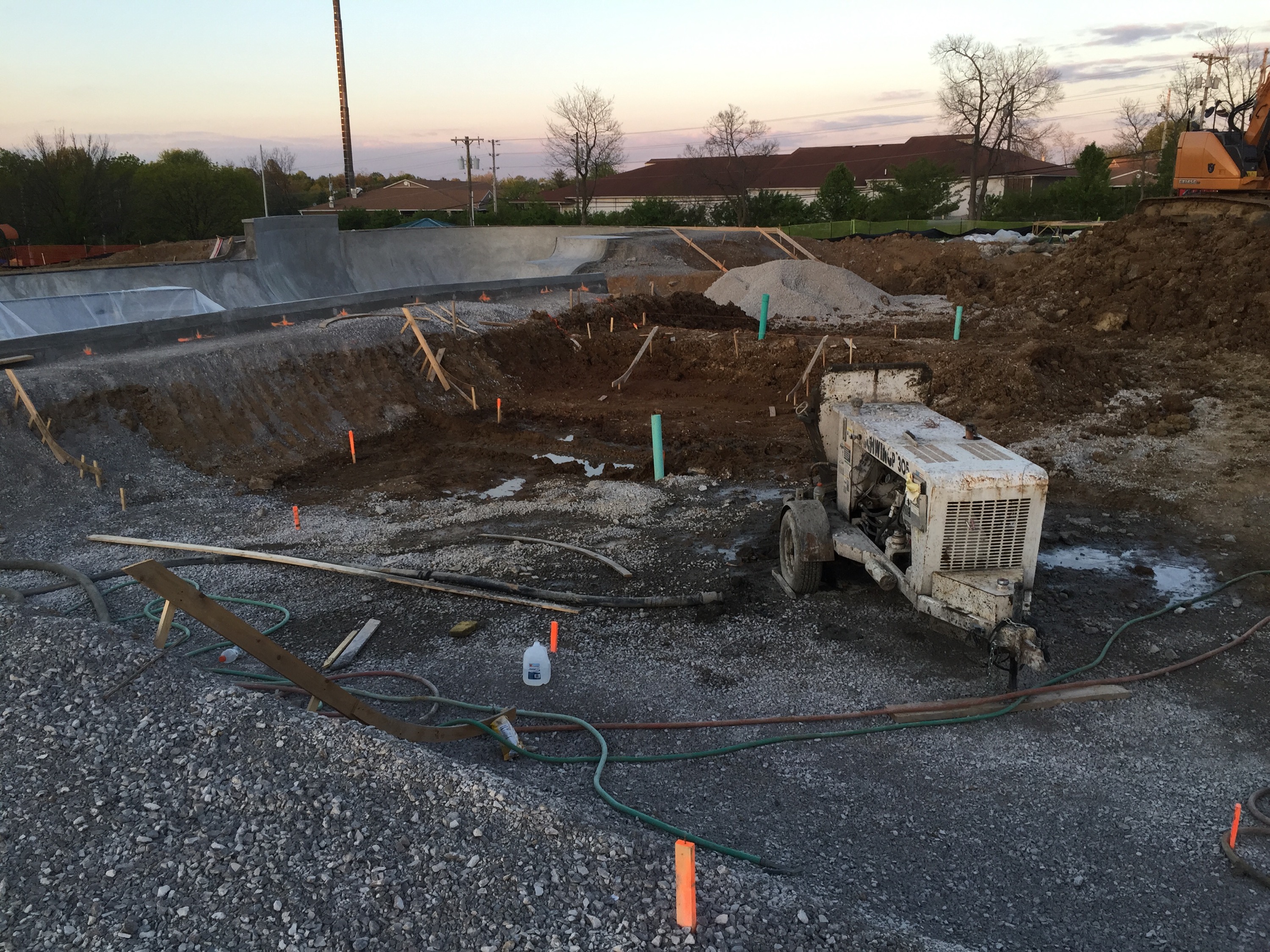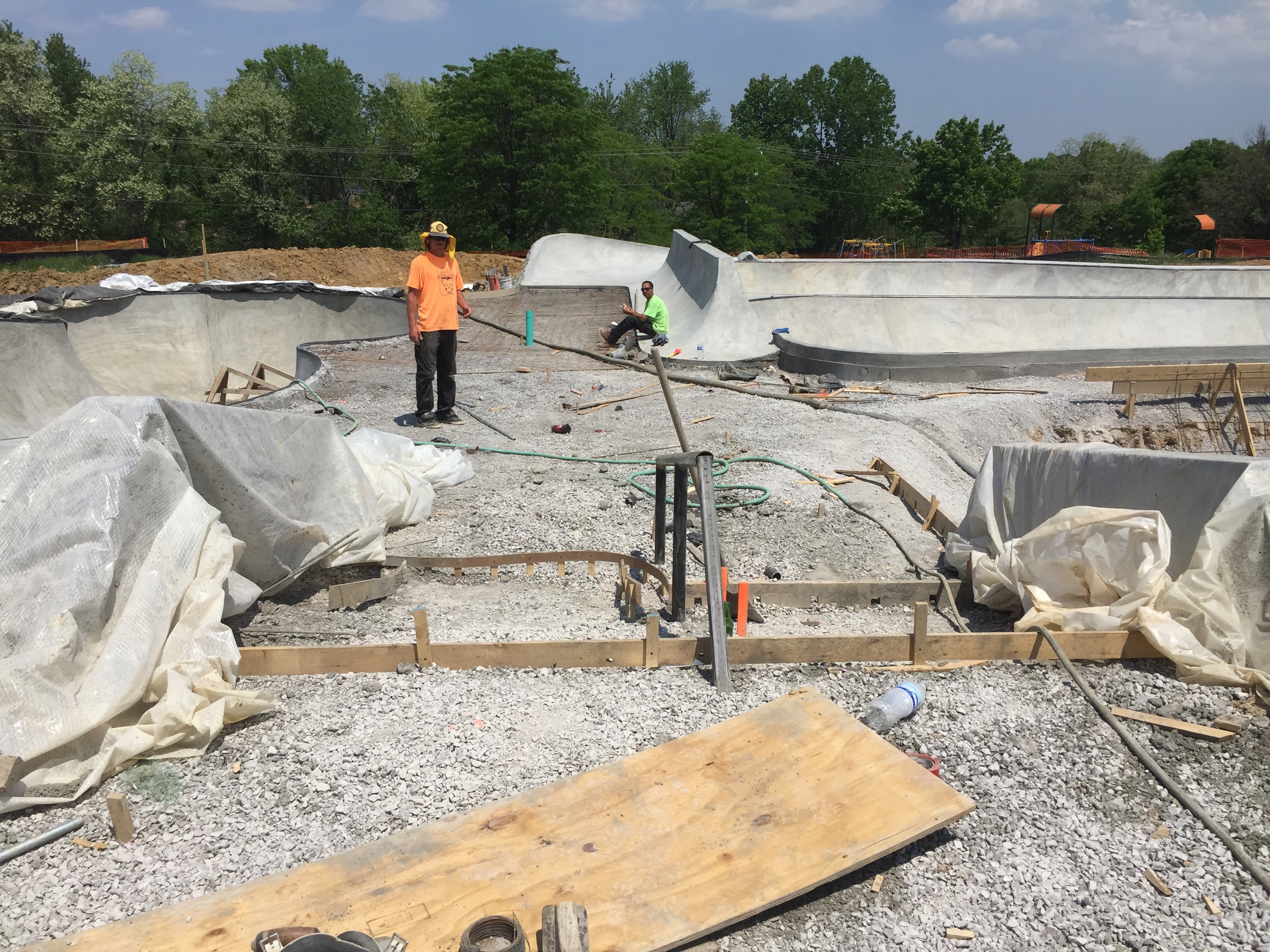 Just stopped by the park and a lot has been going on! Check out the stair section going in, hubbas (covered), brick banks, street section construction and the fresh pool coping they just finished in the shallow end of the snake run when I arrived!